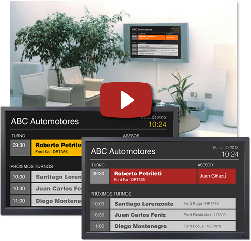El Panel de Turnos resalta el próximo turno a ser atendido emitiendo un sonido e identificando el nombre del cliente y los datos de su vehículo. Cada cliente ve en la pantalla de TV, en tiempo real, cómo se acerca su turno.